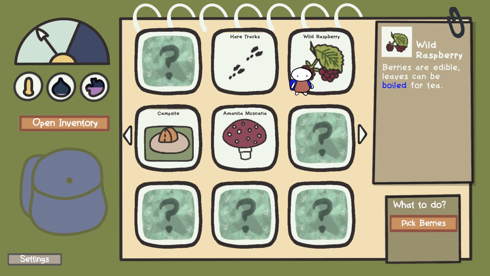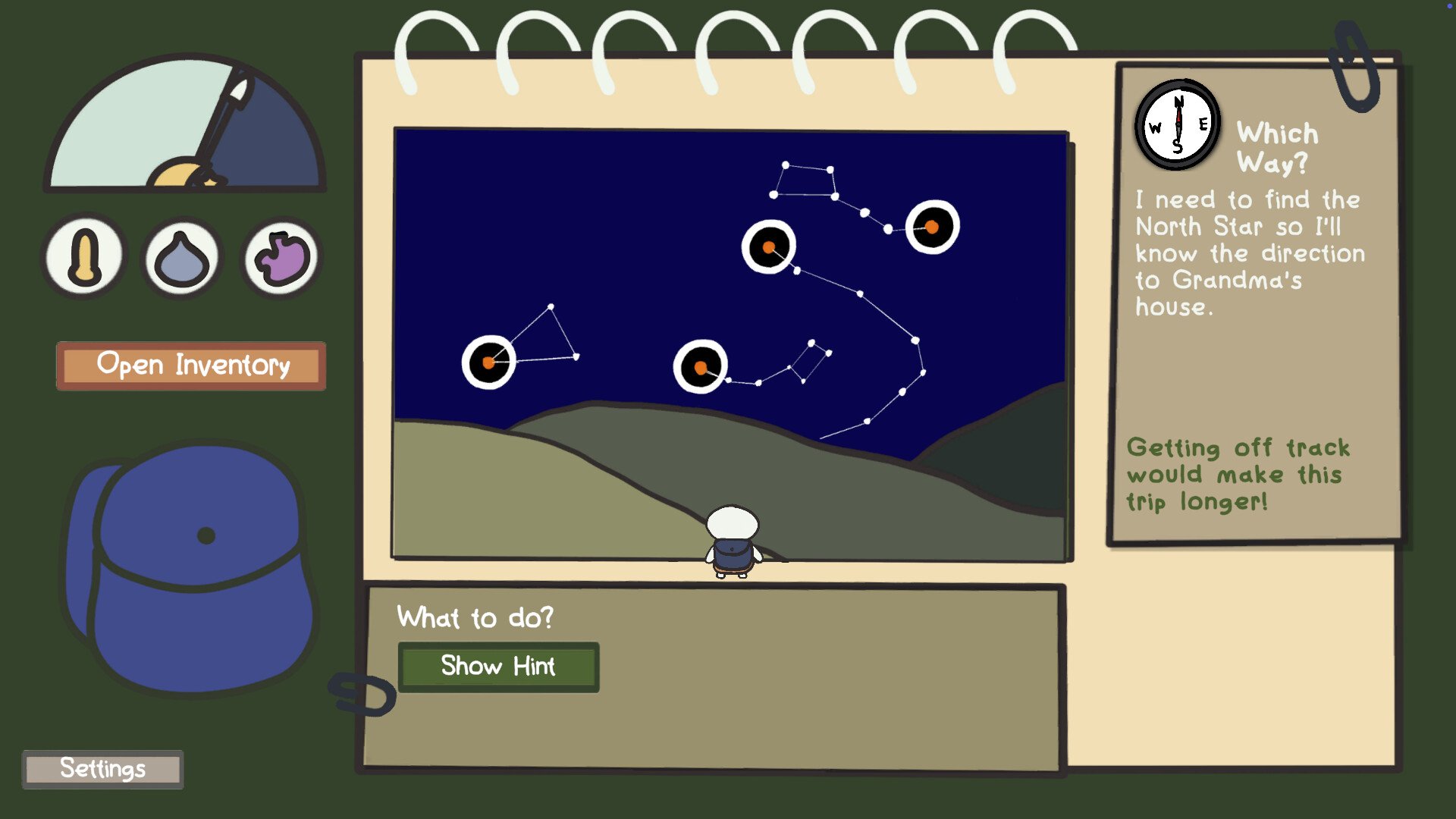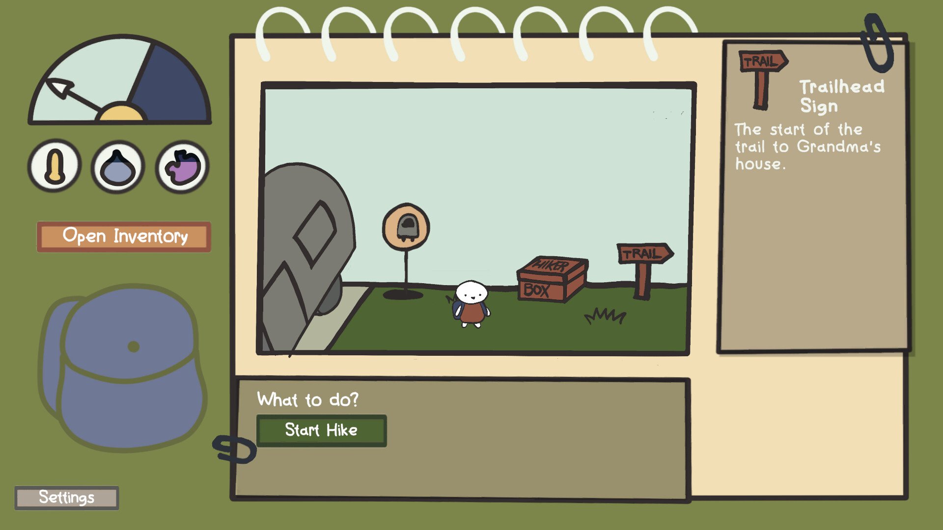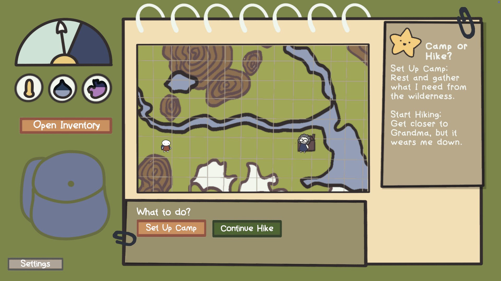 You are a young adventurer journeying to visit your grandmother, a retired ranger, where you’ll learn to thrive in the wilderness and carry on her legacy. Hike the trails close to Grandma, but try not to become a cautionary tale! Set up camp to rest, and explore to gather resources to prepare for the journey ahead. Navigate using the stars or the rising sun, and keep visiting Grandma to earn new tools and skills. Carry them into your next run until the day she deems you ready for grander adventures!