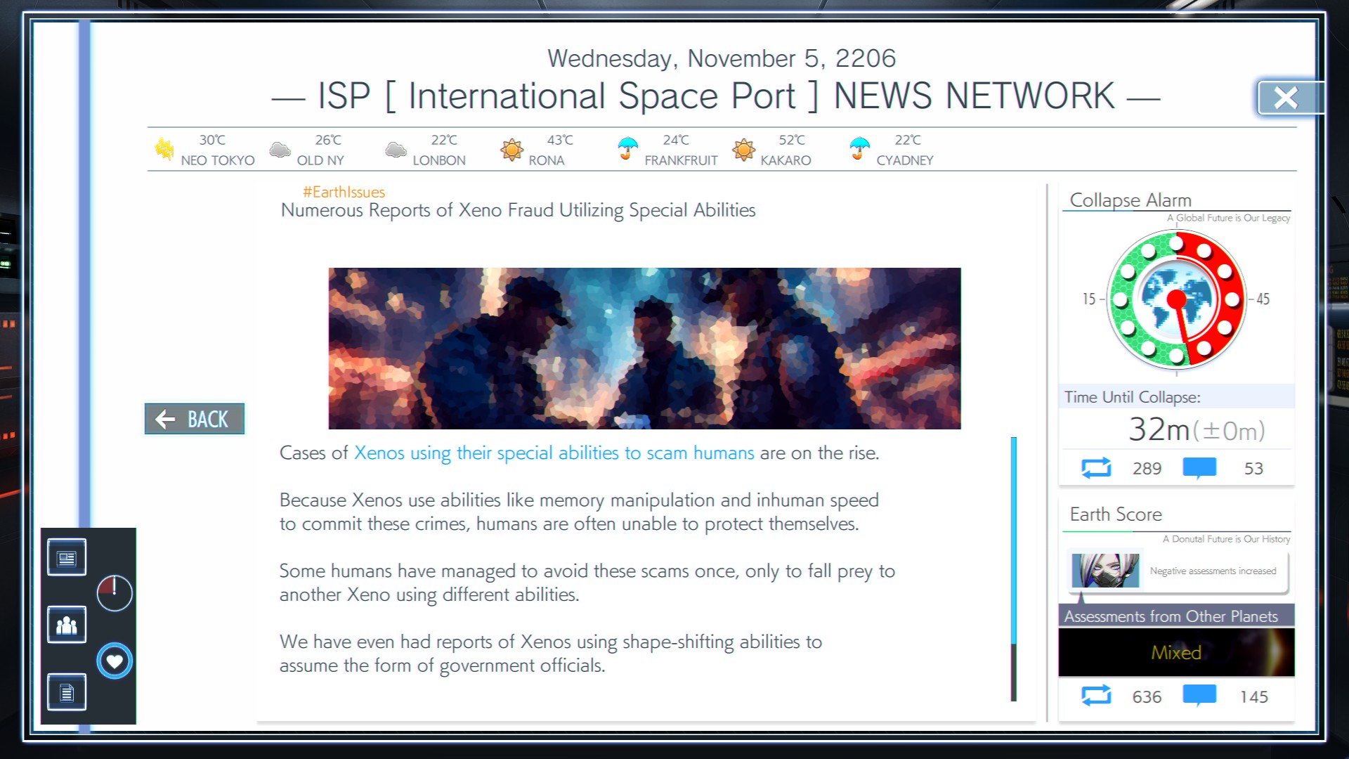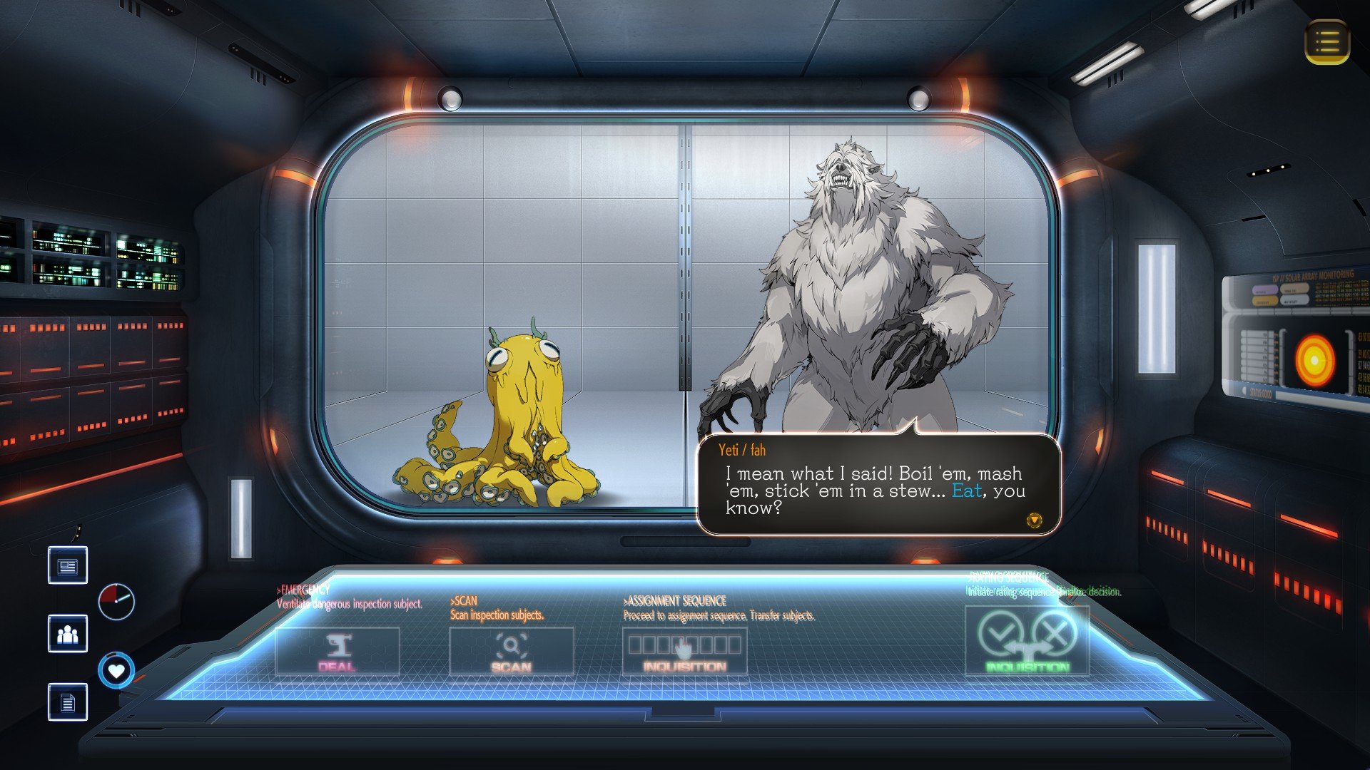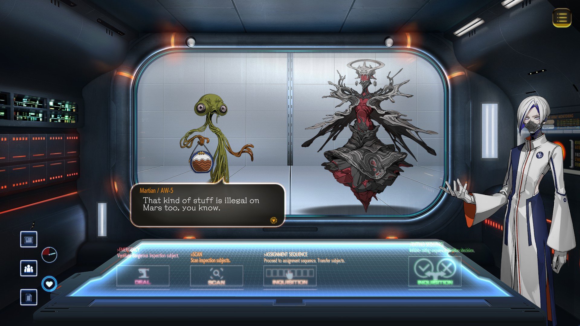 At an International Space Port built upon the remains of the former ISS in the year 2206, take on the role of a "Chief Xeno Inspector" who has awakened from a 150-year cryosleep. To repay a massive debt you have no memory of incurring, you must screen aliens arriving on Earth. Are their intentions truly innocent? Deduce the truth and decide whether to grant entry based on information pulled from their conversations – what they say, who they suspect, and who they protect.