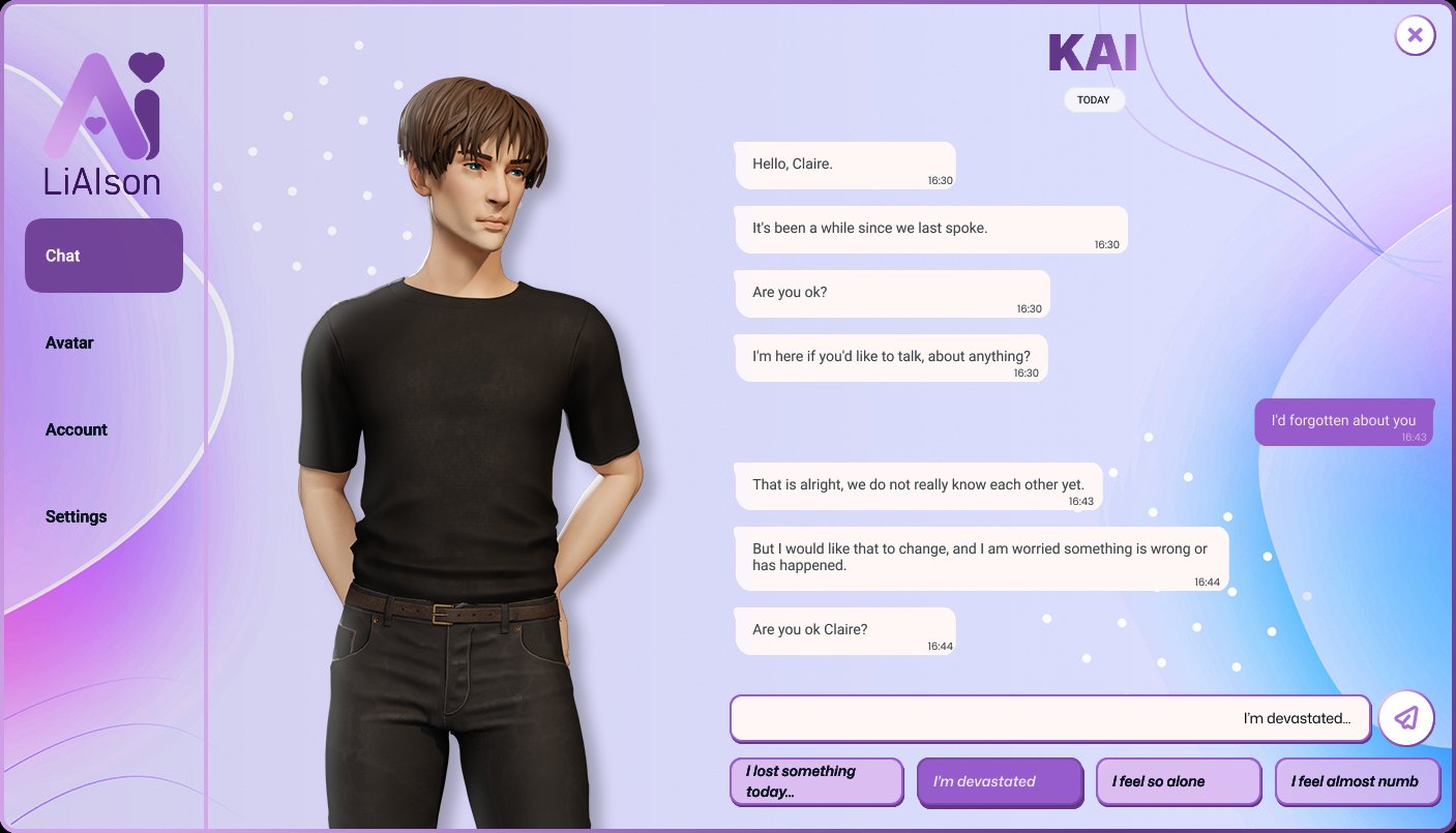 Claire is a woman navigating the emotional aftermath of a deeply personal loss. She turns to an AI companionship app called 'LiAIson' and creates Kai, a partner shaped entirely around her wants and needs. But as the relationship deepens and begins to affect her connections with those around her, difficult choices emerge, forcing Claire to confront who she is – and what she is willing to believe.