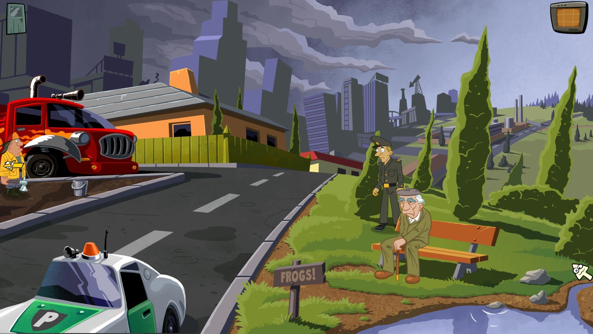 Most of the gameplay is a traditional blend of questioning characters and inventory-based puzzles. As you’re a detective, you need to investigate crimes by talking to people, so pay close attention to every dialog. Generally, conversation topics will change depending on what you have previously done or said. Sometimes you will need to present an object to someone to get them to reveal important information, like pulling your handgun on them or waving your police badge in front of them to prove who you are. (Although Francis rightly mentions on a couple of occasions that his police uniform should be enough.) Different responses are available for the most important conversations and interrogations, but these don’t appear to me to make much difference in the story.