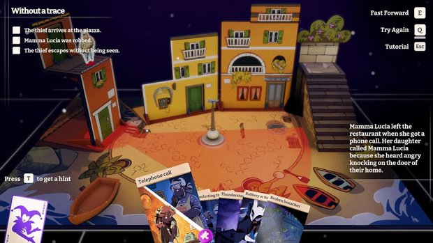 In order to investigate more efficiently, Diana has a special tool up her sleeve, a unique device called a chronolens that she inherited from her nonna Sara. This magical trinket allows her to see how a place looked in the near past, making it useful when examining a crime scene, almost like a “spot the difference”-like puzzle. With the clues collected from her investigations, Diana must make deductions, which are set up like a 3D board game, on which you need to place your cards in the correct sequence, and see the characters recreate their actions on the board.