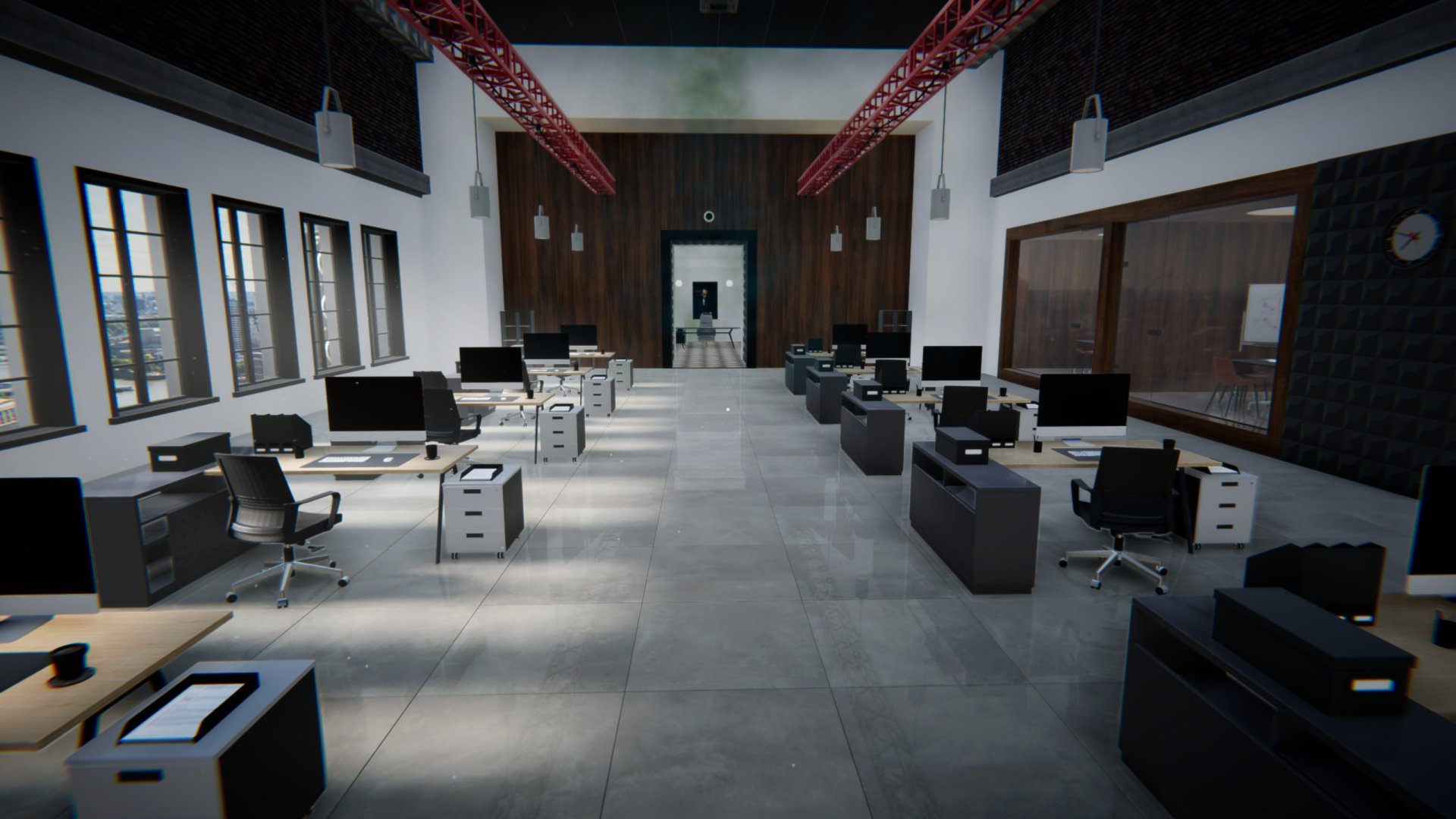 Graphics are crisp and sharp. They feature a desaturated color palette dominated by greys, blues, black and white, creating an emotionally distant atmosphere. The environments are realistically detailed but feel cold and even more clinical than you’d expect from a corporate workplace. For example, desks are devoid of any personal touches, and office spaces feature only motivational posters, if any at all. There is very little ambient animation beyond glimpses of flocks of birds or weather effects like rain that can be seen at times through the windows, but some scenes have more, like water gently rippling in the rooftop pool, and flies seen swarming around rotting food. Strangely, when you look out at the city itself, it’s bereft of any noticeable activity.