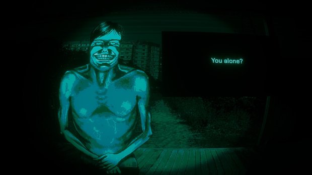 Both indoor and outdoor spaces are portrayed in a unique visual style that blends lifelike images with more obviously (and often grossly twisted) hand-drawn artwork. Your neighbor’s house looks like it could be a real photo set against a grassy plain, but seen through your window it is difficult to tell where the real elements end and the drawings begin. Peering through the peephole of your front door, you’ll see various buildings in the nearby city that look equally photorealistic and yet intentionally pixelated. It’s a striking aesthetic, and when combined with the greenish hue that washes over everything once night falls, it is an artistic vision all its own.