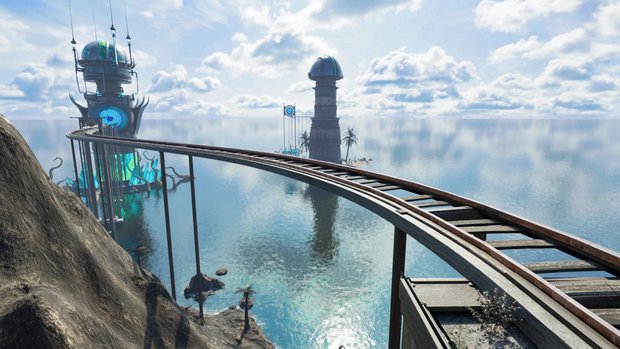 The visuals are a total treat. The wild, steampunk-meets-alien architecture vibe certainly shines through Gwynaire's lens, which captures the wonder of shimmering caves, serene beaches, and even some animated rollercoaster-style thrills when entering some of the island’s methods of transport. And with much of the game's man-made lighting, mystic portals, tranquil waters, and phosphorescent plant life, there's a bit of an obsession with the color cyan as a visual motif. It's an unconventional choice that makes it visually distinct, and whether intentional or not, I couldn't help but take it as a charming little nod to the giants upon whose shoulders Neyyah stands.