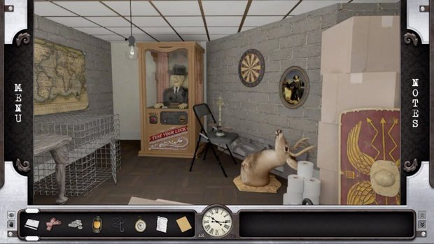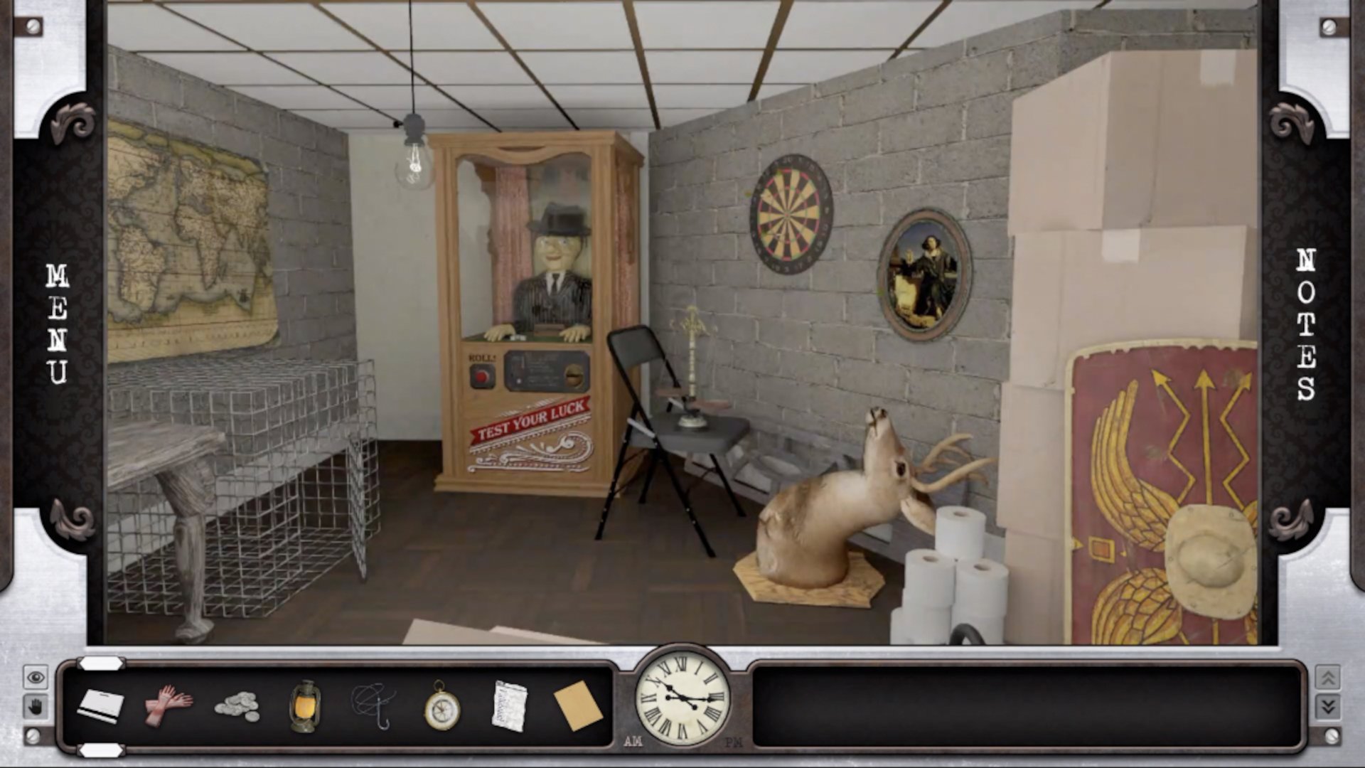 As you comb through the scenes in each location, the cursor icon lets you know which directions you’re able to move and when you can fluidly turn in place to get a full 360° view of your surroundings. Navigating is a little clunky at times; I clicked back and forth and spun around doing an awkward Wait, where’s the exit? dance more than once. But I never minded the chance to double check a scene in case I’d missed a hotspot, the cursor changing to identify them when moused over. Most lead to a puzzle or item, and even when one seems to lead to nothing, it might not always, because several hotspots are only fully interactive after arriving at the relevant point in the game. So if you find a box or a drawer that you can open but not take anything from, remember it. There’s likely an item inside you’ll need later on.