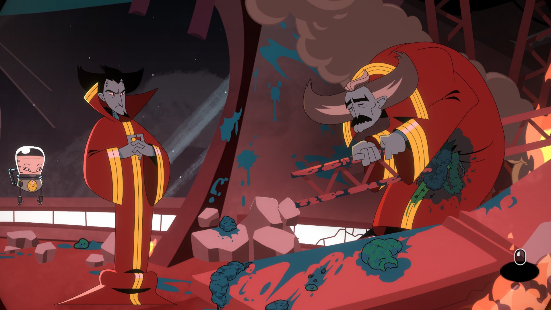 Character models are all incredibly expressive and equally diverse as well. Some are literal piles of flesh with a single mouth, while others are squid-like with multiple tentacles moving about as they get from one place to another. VValak looks like a rejected Flash Gordon villain, complete with spiked black hair and a lanky frame adorned in a long regal red robe that hides his feet whilst he shuffles about with his eyes darting around. Milky is a small floating android with two long dangly arms, the majority of her body comprised of a literal jar of milk, plus a nipple nozzle for drinking said milk. VValak and Milky in particular have a huge variety of facial expressions and poses that add an additional layer to their personalities and moods, and it was a delight to watch them articulate their lines.