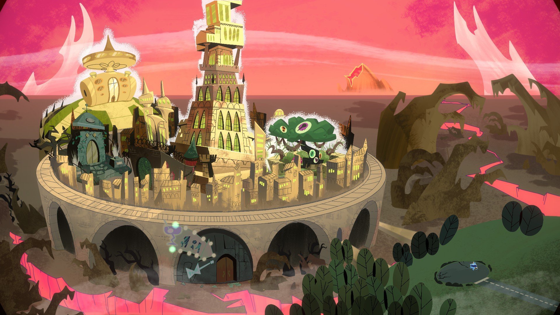 I can’t blame anyone for wanting to keep the game moving along rather than stopping to read more, because Earth Must Die is a gorgeous cartoon spectacle. The world is bright and colorful, which contrasts hilariously with the over-the-top violence and adult subject matter. The art style is hugely evocative of the works of Genndy Tartakovsky, especially his work on Samurai Jack (which happens to be one of my childhood favorites). Alien architecture is purposefully jagged and imposing on The Spire where VValak overlooks his subjects of Tyryth, while there’s a sleek metallic, cold sheen to the interiors of the buildings and ships the Terranoids inhabit that reflect the authoritarian rule of their emperor’s tastes. The palette of colors on display offers lots of variety. The capital city on Tyryth is adorned in golden-yellow luxury with lime green windows mixed in, along with an oragne-red sky that gives off a suitably otherworldly feel. The aptly named “Microworld” is awash with neon pink, against a backdrop of purple and blue hues.