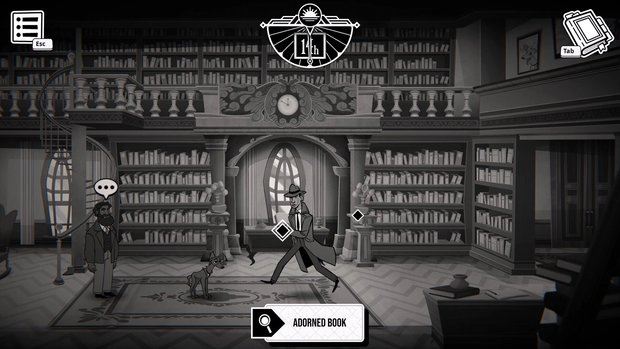 Time is constantly moving forward, even if you stand still and do absolutely nothing. There’s a clock at the top of the screen that displays the current hour, and a moving dial will slowly tick from left to right towards the next hour. Each hour is divided into twelve slots, and it takes about 30 real-time seconds to advance from one hour to the next. It works a bit differently during conversations, to take into account individual players’ reading speeds. The clock isn’t displayed then, but it will pop up to show it has moved a couple of slots with each topic explored that delivered some valuable information. You can’t always ask a suspect about all topics, though, since they have their own schedule and will often break off the conversation because they need to be somewhere else.