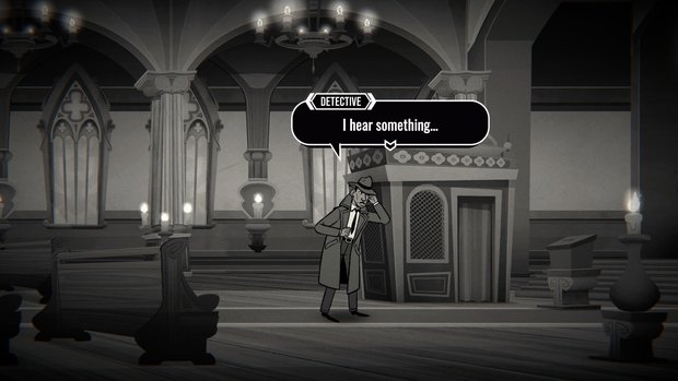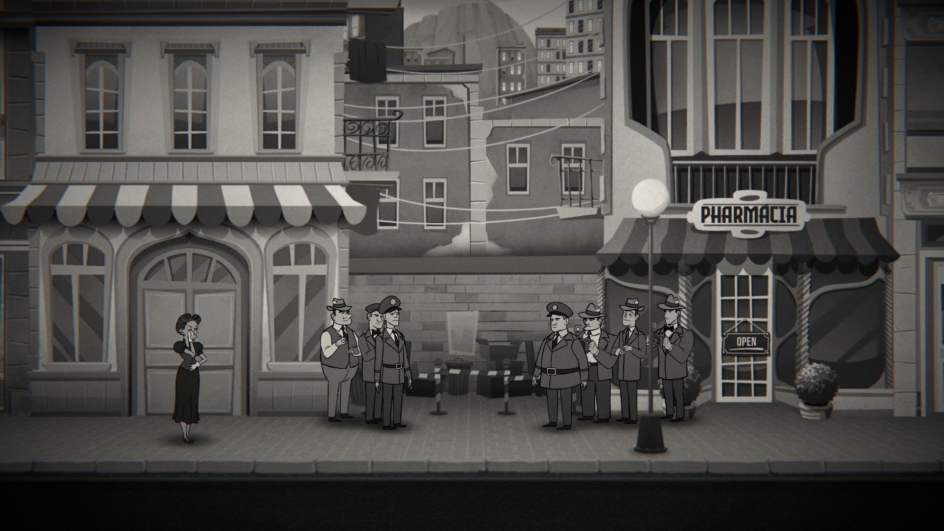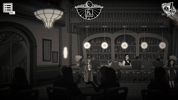 All 2D characters and backgrounds are hand-painted in hi-res black and white. There’s a graphic novel feel to the aesthetic; not Frank Miller’s Sin City but more cartoonish. You start off downtown, which houses your office, a café, a church, a nightclub, and a pharmacy. As you talk to people, they might refer you to other neighborhoods, like the harbor, the villa district, and the industrial block. Each location has taxi stands you can use, but travelling also costs time.
